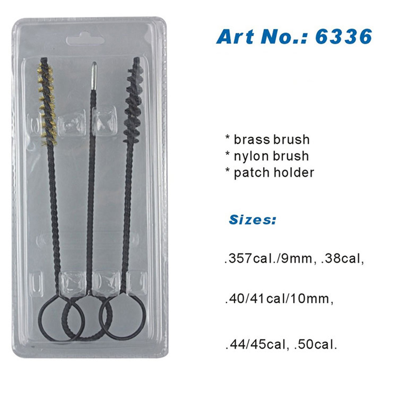 3 pcs सेट हँडगन क्लिनिंग किट, दुहेरी फोड मध्ये पॅक. एक पितळी बोअर क्लीनिंग ब्रश, एक नायलॉन बोअर क्लीनिंग ब्रश आणि एक स्लॉटेड पॅच होल्डर. सुलभ आणि प्रभावी.