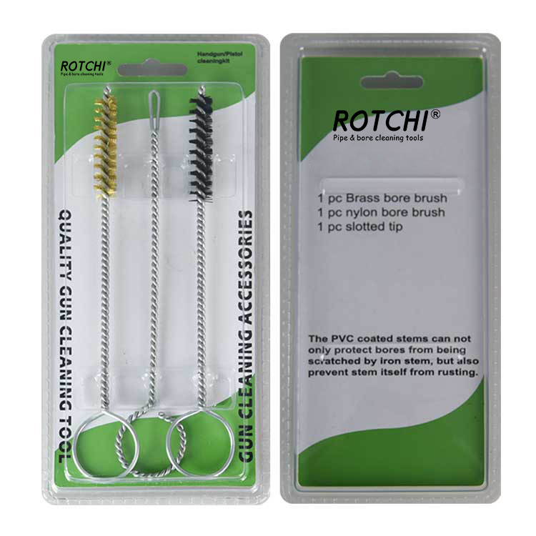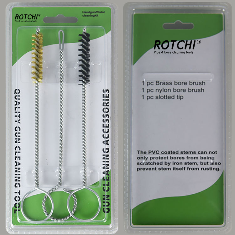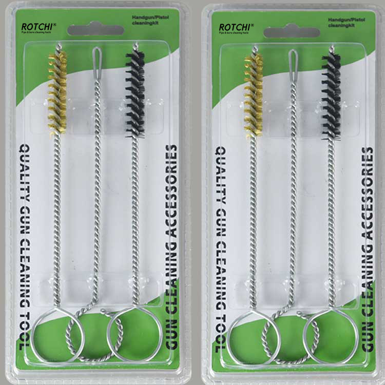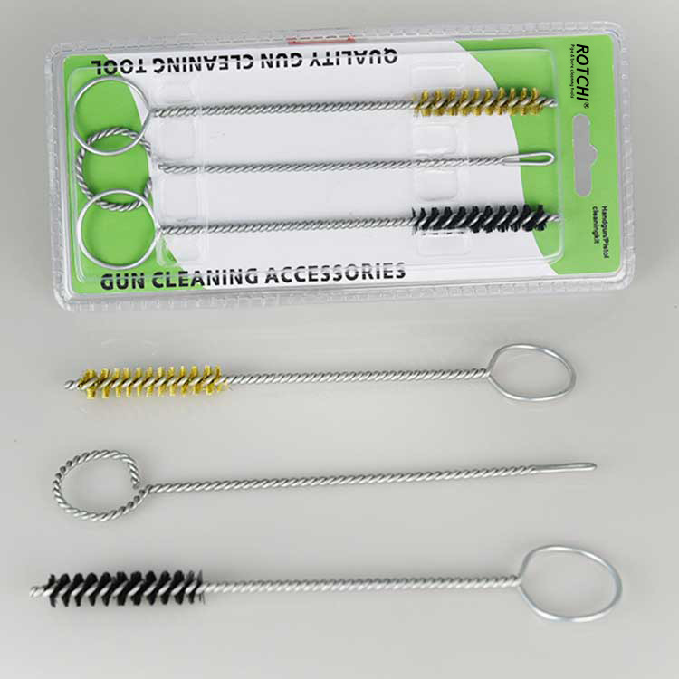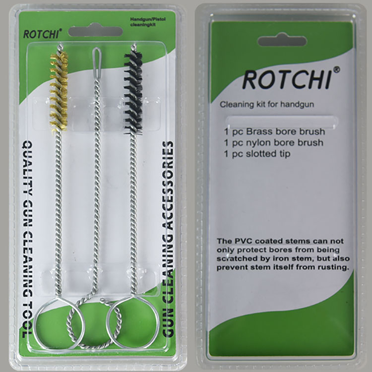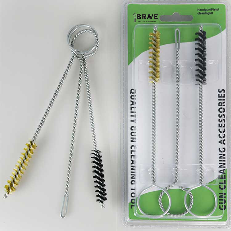 3 pcs सेटहँडगन क्लीइंग किट, दुहेरी फोड मध्ये पॅक. एक पितळी बोअर क्लीनिंग ब्रश, एक नायलॉन बोअर क्लीनिंग ब्रश आणि एक स्लॉटेड पॅच होल्डर. सुलभ आणि प्रभावी.