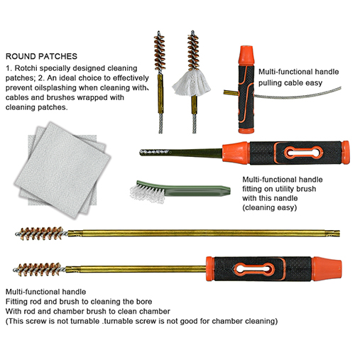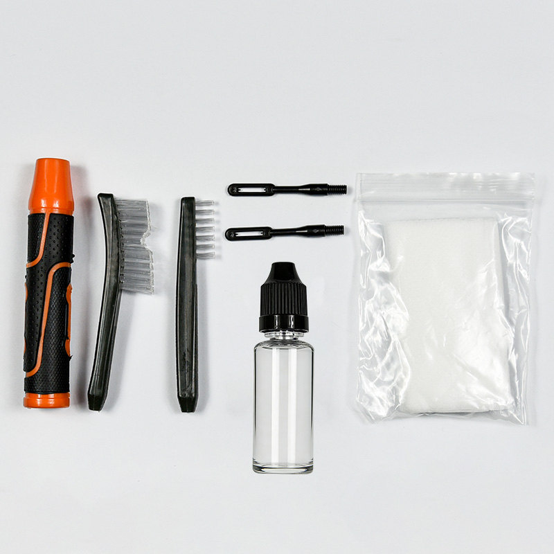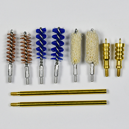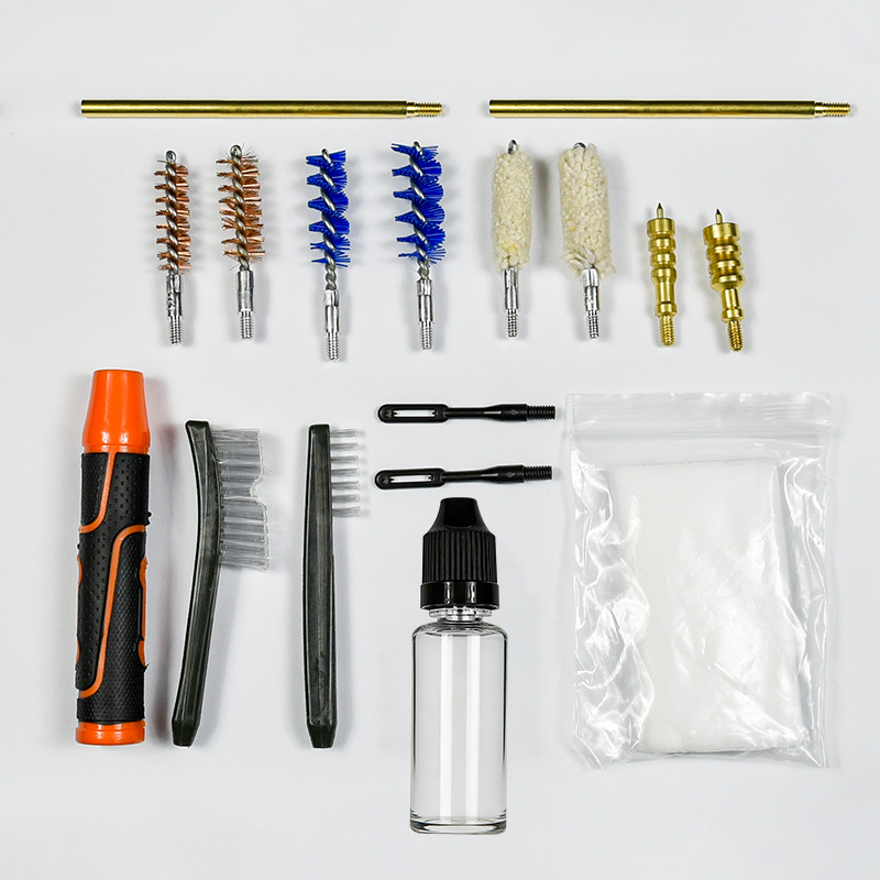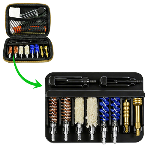 हँडगन क्लीनिंग किटमध्ये 2 आकार (9 मिमी आणि .45 कॅल.) समाविष्ट आहेत. OX कापडाचा लेप झिप सह पीव्हीसी केस. पितळी ब्रशेस, कॉटन मॉप्स, नायलॉन ब्रशेस, पितळेच्या कुंड्या, 2 रॉड. निवडीसाठी वाळू आणि काळा रंग.