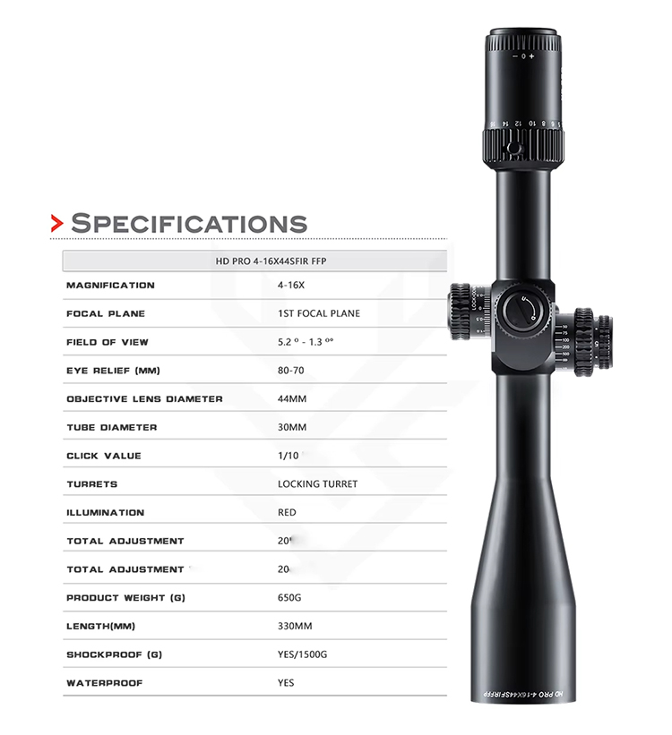 ऑप्टिक्स HD PRO 4-16X44 SFIR FFP हाय शॉक रेझिस्टन्स हंटिंग स्कोप टॅक्टिकल लाँग रेंज शूटिंग 30 मिमी ट्यूब