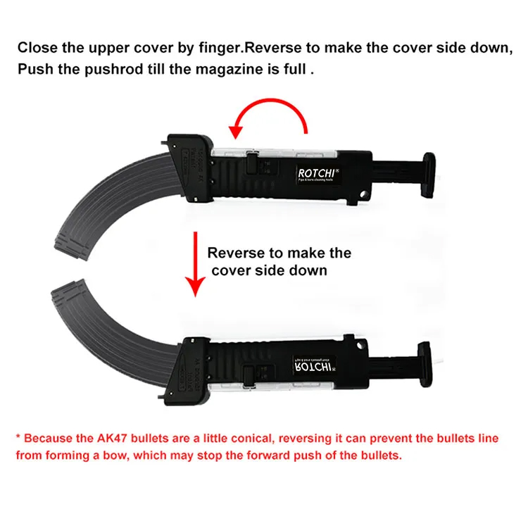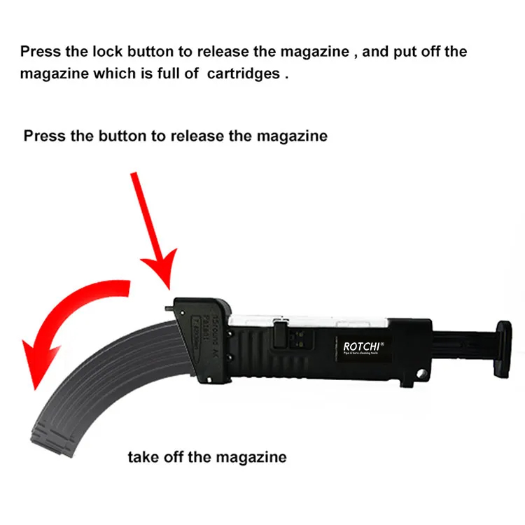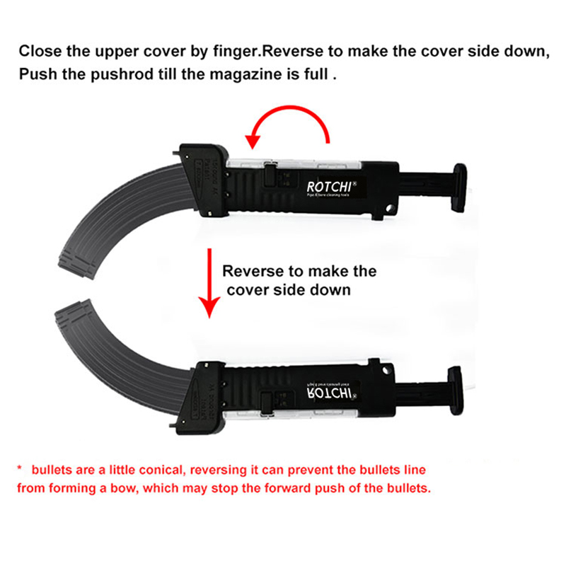 ● खोबणीत काडतुसे भरून टाका, एके यांत्रिक तत्त्वाप्रमाणे मासिके स्थापित करा. पुशरला पुश करा, काडतुसे सहजपणे मॅगझिनमध्ये प्रवेश करतील.