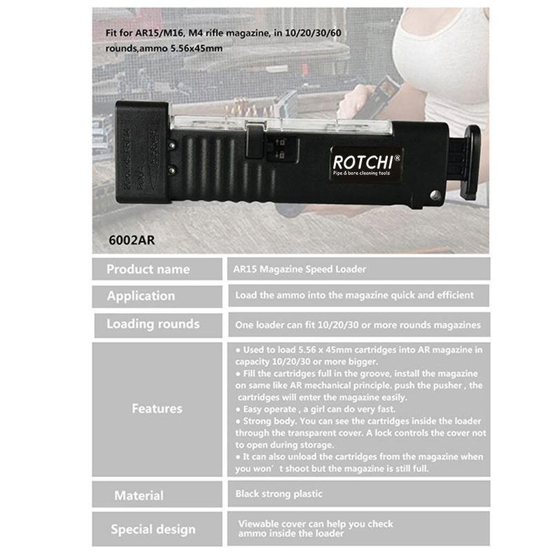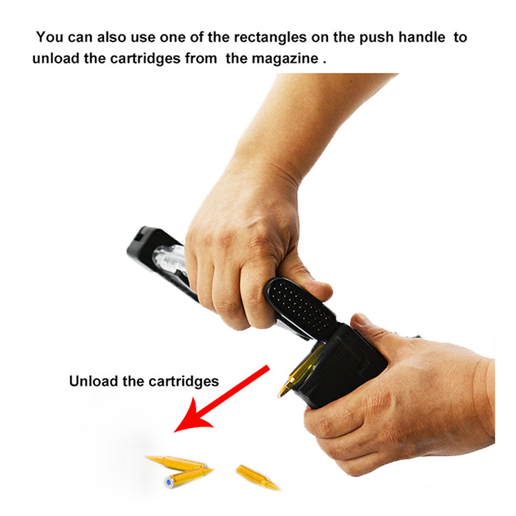 ● 10/20/30 किंवा त्याहून मोठ्या क्षमतेच्या AR मासिकामध्ये 5.56 x 45mm काडतुसे लोड करण्यासाठी वापरले जाते.
