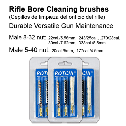रायफल बोअर क्लीनिंग ब्रश 3-इन-1 सेट, ब्लिस्टर आणि कार्ड पॅकेज. उपलब्ध आकार: .177, .22, .25, .27, .30,.338 कॅल.